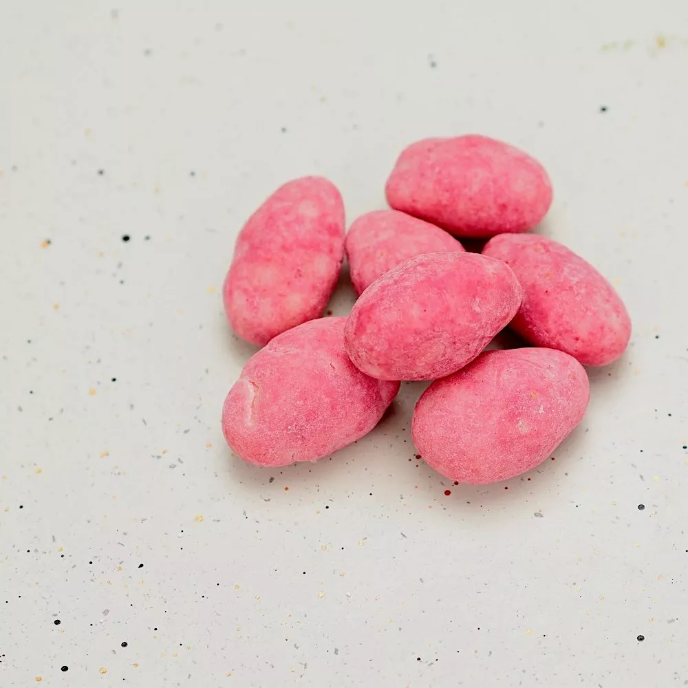 Zucker, Mandeln (20%), Kakaobutter, Vollmilchpulver, Molkepulver, Laktose, Erdbeerpulver (2, 25%), Glukosesirup, Emulgator (Sojalecithin), Erdbeeraroma, Rote-Beete-Saft, natürliches Vanillearoma. Die weiße Schokolade enthält mindestens 25% Kakaoanteil. Spuren von Erdnuss, Haselnuss, Cashewnuss, Paranuss und Pecannuss können enthalten sein. |
