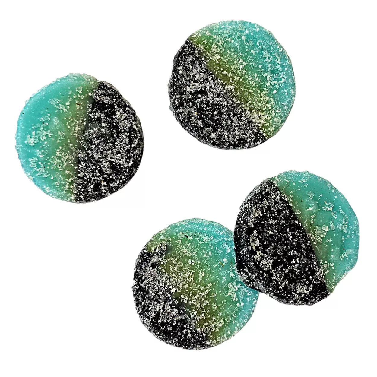 Zucker, Glukosesirup, Stärke (Mais), Wasser, E1420, Säureregulator (Apfelsäure E296, Milchsäure E270, Zitronensäure E330), Aromen, Ammoniumchlorid (Salmiak), Farbstoffe: E171, E153, E133. |