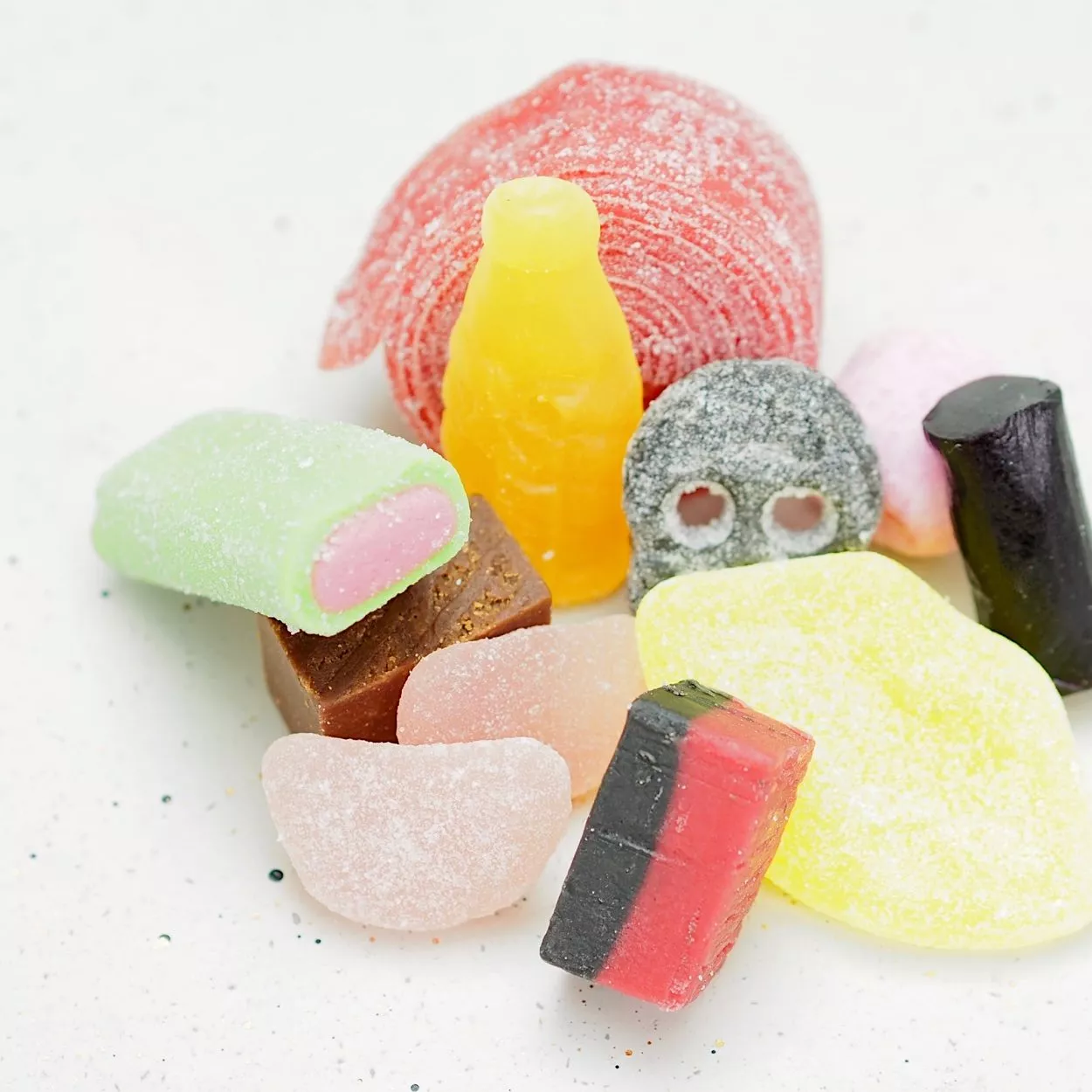 Zucker, Glukosesirup, Fruktosesirup, Melasse, geröstete Cashew, Mandeln, geröstete Haselnüsse, Joghurtpulver, Kokosflocken, Bananenchips, Puffmais, Stärke, Pflanzenöl (Kokos, Palm, Soja, Shea, Raps), Vollmilchpulver, Magermilchpulver, modifizierte Stärke, Kartoffelprotein, Milchzucker, Kakaomasse, Kakaobutter, Molkenpulver, Milchfett, Maltodextrin, Lakritz-Extrakt-Pulver, Ammoniumchlorid, Dextrose, Weizenmehl, Anisöl, Invertzuckersirup, Maisstärke, Sorbit, Eiweiß von Hühnereiern, Säuren (E270, E296, E330, E334), Stabilisatoren (E331, E325, E422), Aromastoffe, Emulgator (E471, E322, E473), Farbstoffe (E100, E120, E132, E133, E141, E150d, E153, E160a, E171, E555), Gelatine, Verdickungsmittel (Gummi arabicum), Feuchthaltemittel (Glycerin), getrocknetes Himbeer-Pulver, Konservierungsmittel (E202), Überzugsmittel (E 901, E903, E904)Anteile variierenAllergene: Gluten, Milch, Soja. Spuren von Haselnüssen, Cashew, Paranuss, Pecan und Mandeln können auftreten |