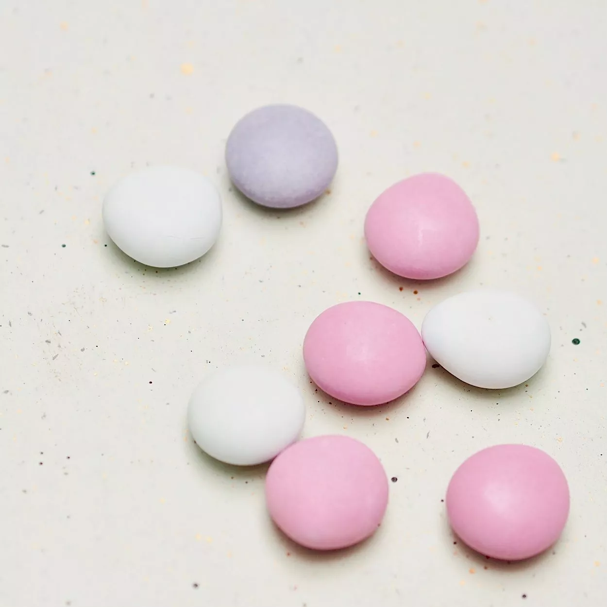 Zucker, Kakaomasse, Glukosesirup, Kakaobutter, Vollmilchpulver, Verdickungsmittel (Gummi arabicum), Emulgator (Rapslecithin), Pfefferminzöl, Farbstoff (Titandioxid, Anthocyane, Karminrot), vollständig ausgehärtetes Pflanzenfett (Palmkern). Kann Spuren von Nüssen enthalten. |
