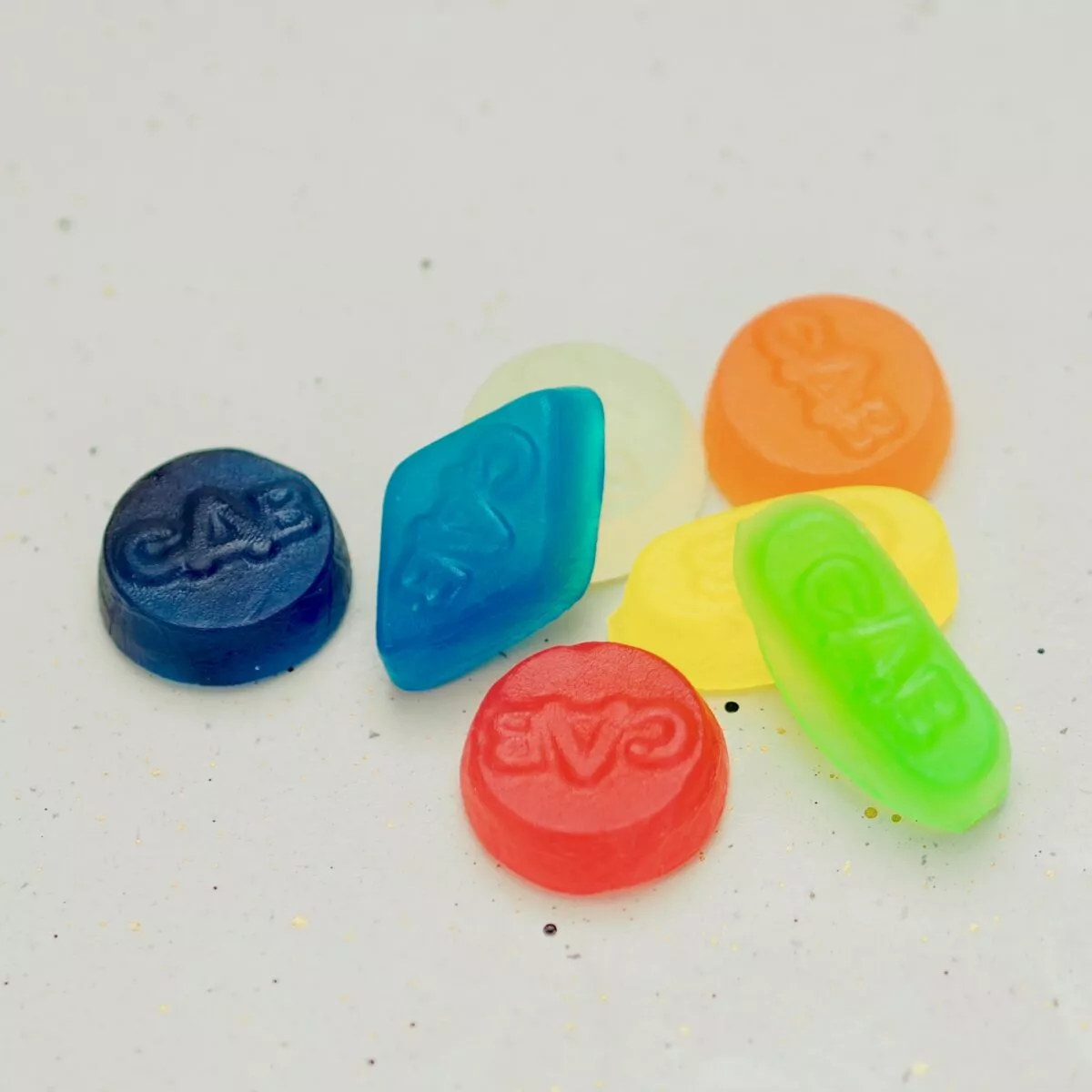 Süßstoffe (Maltit), Stärke, Gelatine, Säuren (E260, E270), Aromastoffe, Beschichtungsmittel (Pflanzenpalmöl, Carnaubawachs), Farbstoffe: E 100, E 120, E 160a, E-133.Enthält Maltit, kann bei übermäßigem Verzehr abführend wirken. |