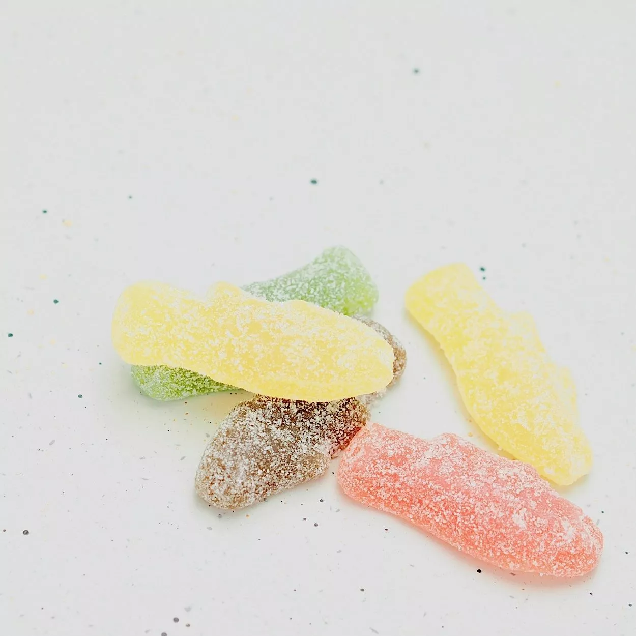 Zucker, Glukosesirup, Gelatine, Säureregulator E296, E330, Aromastoffe, Farbstoff E120, E141, E150d, E160a, E903 Oberflächenbehandlungsmittel. |