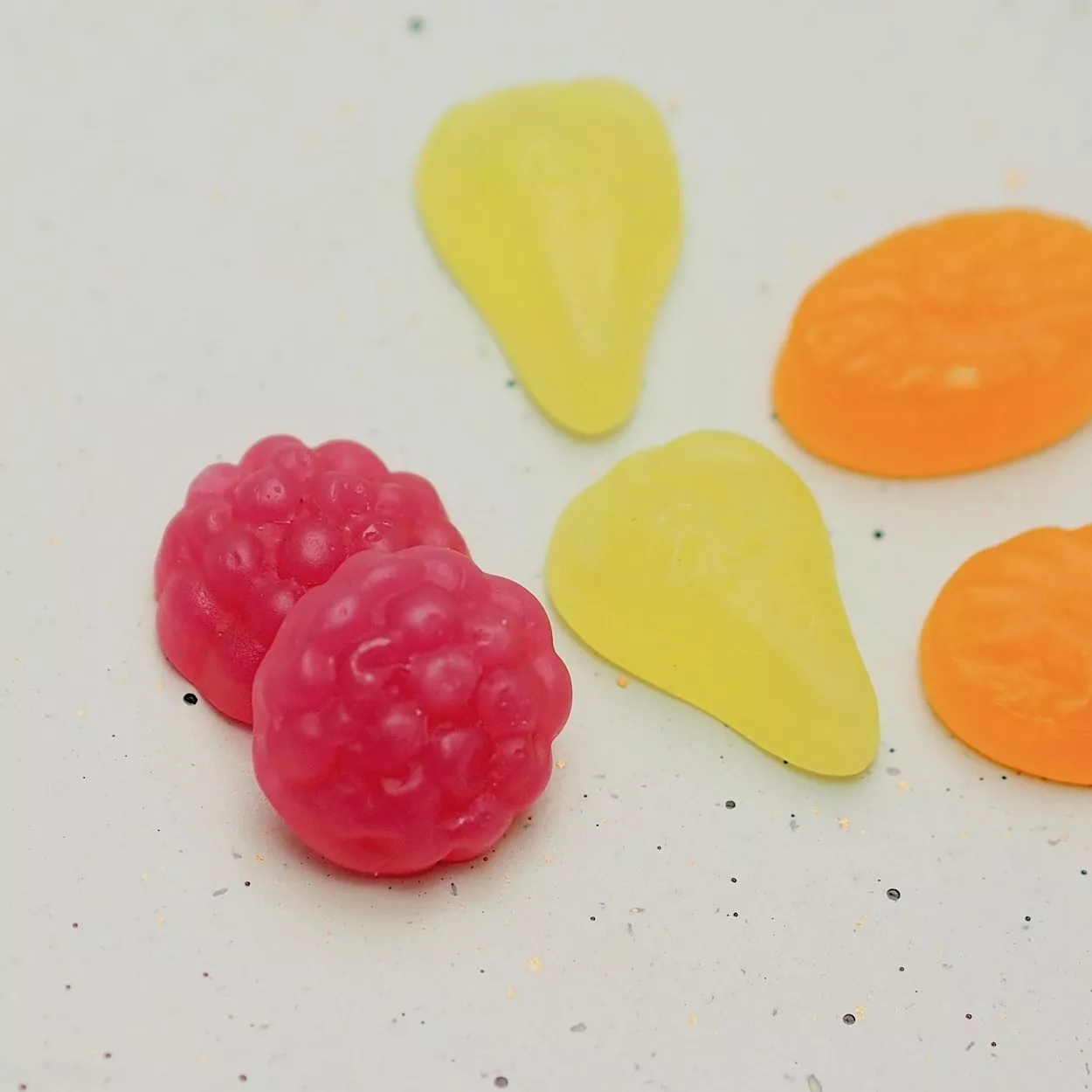 Zucker, Glukosesirup, Weizenstärke, modifizierte Stärke, Säureregulatoren (Milchsäure, Natriumlactat), Farbstoffe (schwarzes Karottenkonzentrat, Distel, Süßkartoffel, Spirulina und Apfel), natürliche Aromen, Oberflächenbehandlungsmittel (Carnaubawachs). |